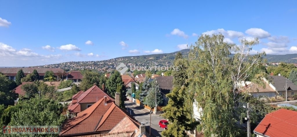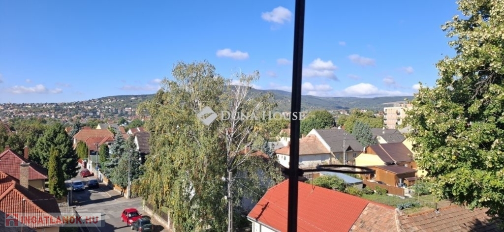 Erkélye pici, asztalka és két kis szék éppen hogy elfér, zöldre, a tv toronyra és a Havihegyi templomra panorámás.