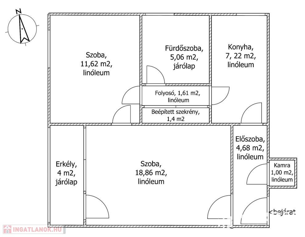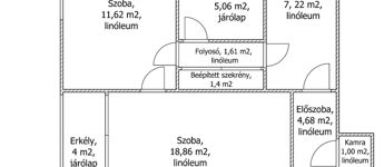 A szobák, a folyosók, és a konyha is linóleumos melegburkolattal rendelkezik.