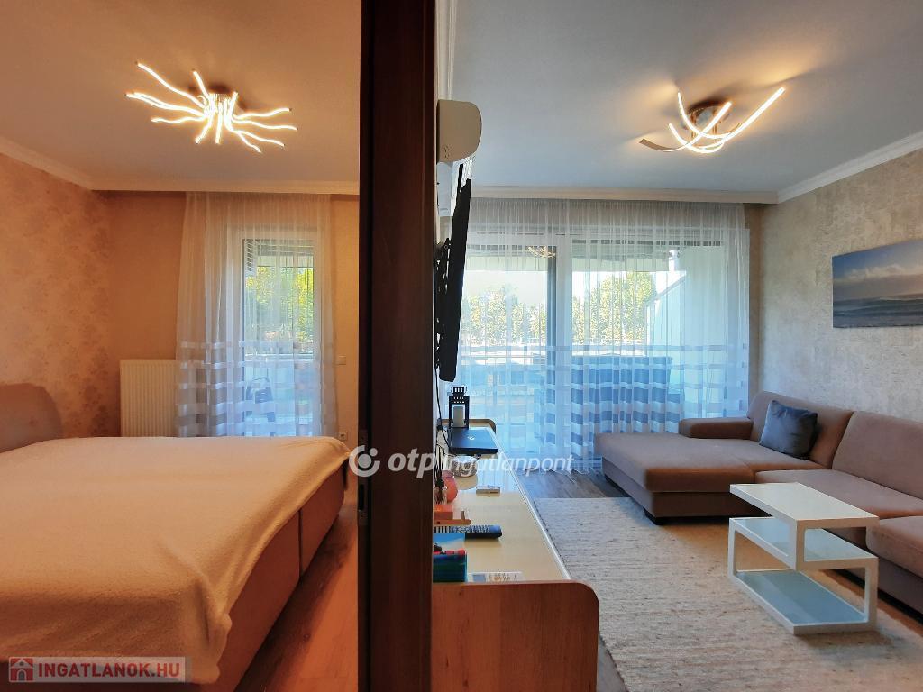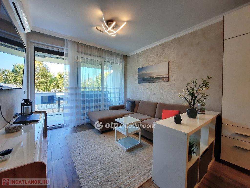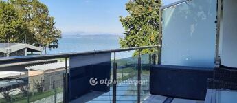Balaton déli part Siófok 66 m2 lakás eladó. A balatoni panorámás ingatlan az Ezüstparton, vízparti társasüdülő 1. emeletén helyezkedik el, nyugati tájolással. A magas minőségű belsőépítészeti megoldásokkal, teljesen felszerelt és gépesített konyhabútorral, minden bútorral, berendezéssel együtt kerül értékesítésre, melyet a vételár tartalmaz. A bekerített területen belül a lakáshoz tartozik egy felszíni parkolóhely, ennek árát nem tartalmazza a hirdetési ár. Az első emeleten a lakáshoz vásárolható egy 2,7 m2-es tároló. Az emeleti lakás megközelítése lifttel biztosított. A lakótérhez és a nyugati oldali hálóhoz kapcsolódó 12 m2-es erkélyről csodálatos panoráma látható. A társasüdülő környezete parkosított, az építészeti megoldások igényes kivitelűek. A társasüdülő saját kijárattal rendelkezik a szabad strandra. A fűtés és meleg víz ellátás kondenzációs kombi gázkazánról megoldott, a lakótér klimatizált. A homlokzati nyílászárók korszerű szerkezetek, elektromos redőnyökkel kiépítve. Bővebb információért keressen telefonon!