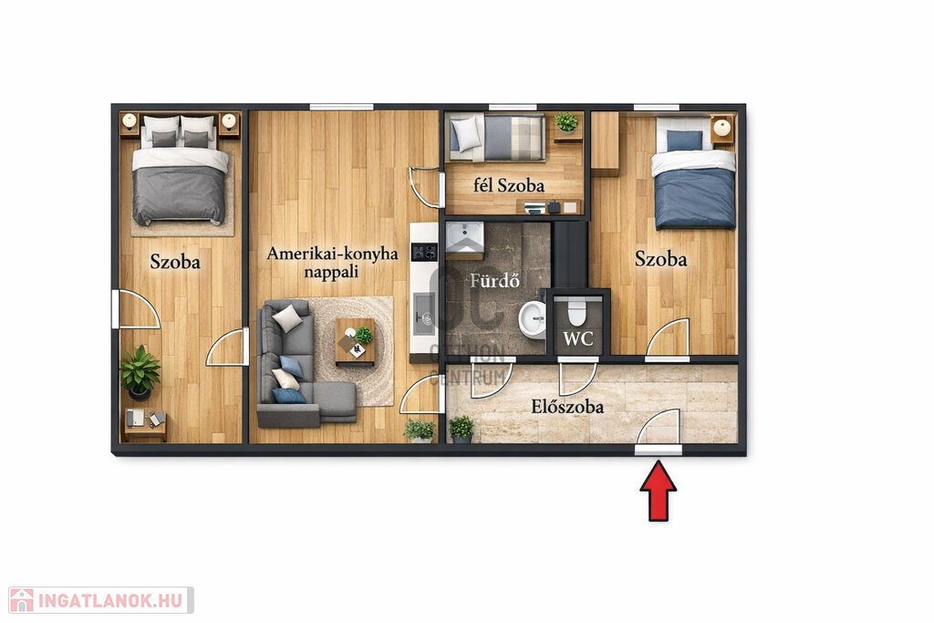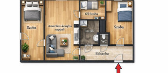 Az amerikai-konyha nappalin kívül, a 49 m2-es lakás magában foglal egy tágas előszoba-közlekedőt, két hálószobát, egy kisszobát egy fürdőszobát és egy külön mellékhelyiséget.