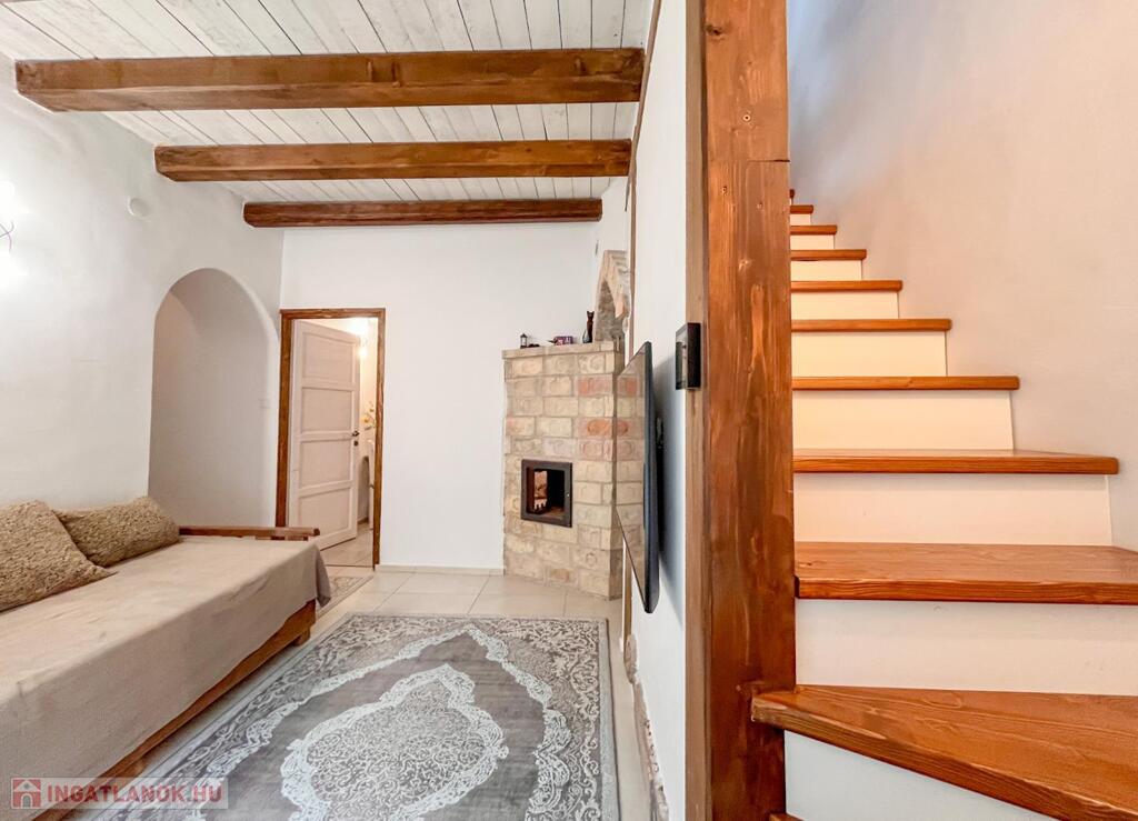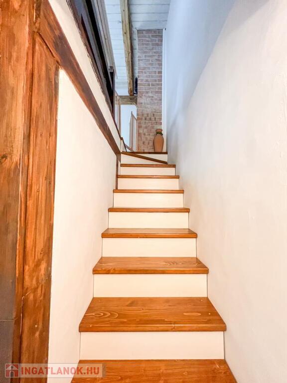 A tetőtér beépítésekor megmaradt az eredeti, karakteres fagerendás födém, amely esztétikai és történeti értéket képvisel.