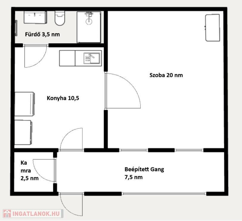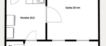 1 szoba, Nagy étkezős konyha, Fürdőszoba, Kamra, előtér.
