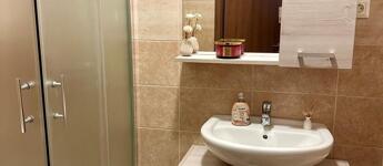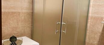 a fürdőszoba igényes burkolatokkal, zuhanykabinnal került kialakításra.