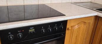 A konyha étkező bútorzata tölgyfából készült, a hűtőt a sütőt és a villany tűzhelyet is magában foglalja.