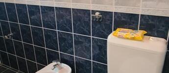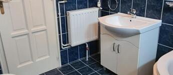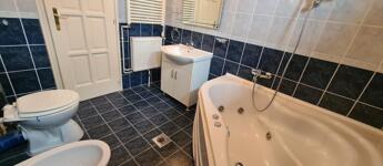 A fürdőszoba tágas, sarokkádas, 2 ablakon keresztül is érkezik be fény, törölközőszárító radiátorral és bidével is felszerelt.