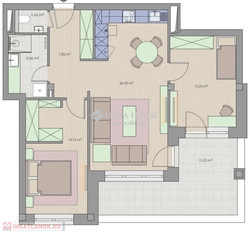 A lakások 2-3 szobásak, minden lakás déli tájolású, teraszos.