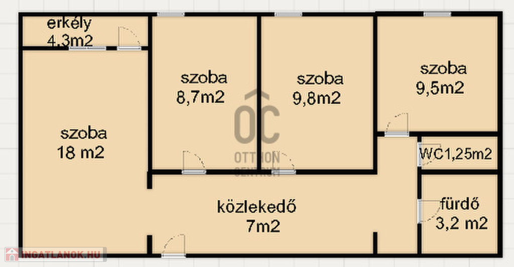 3 külön nyíló szoba, egy tágas konyha–étkező–nappali, fürdőszoba, külön WC, közlekedő és erkély biztosítja a kényelmes, jól szeparált életteret.