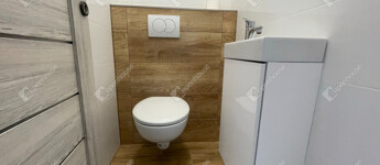 A fürdőszobában új Geberit WC, fürdőkád, valamint mosógép- és szárítógép csatlakozás került kialakításra. A dupla mosdókagyló beépítése is megoldható. A különálló mellékhelyiség szintén új Geberit WC-vel és kézmosóval felszerelt.