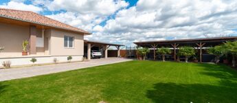 A gyönyörűen parkosított kert pálmafákkal és olajfával van teleültetve, automata öntözőrendszer van kiépítve, valamint fúrt kút is rendelkezésre áll. Az udvarban egy 40 m²-es fedett terasz is helyet kapott, így a szabadidő kellemesen tölthető a friss levegőn. Az autók elhelyezésére egy elektromos garázsajtókkal felszerelt 68 m² dupla garázs, valamint az előtte elhelyezkedő 80 m²-es fedett gépkocsibeálló áll rendelkezésre. A biztonságról a kiépített kamera- és riasztórendszer gondoskodik.