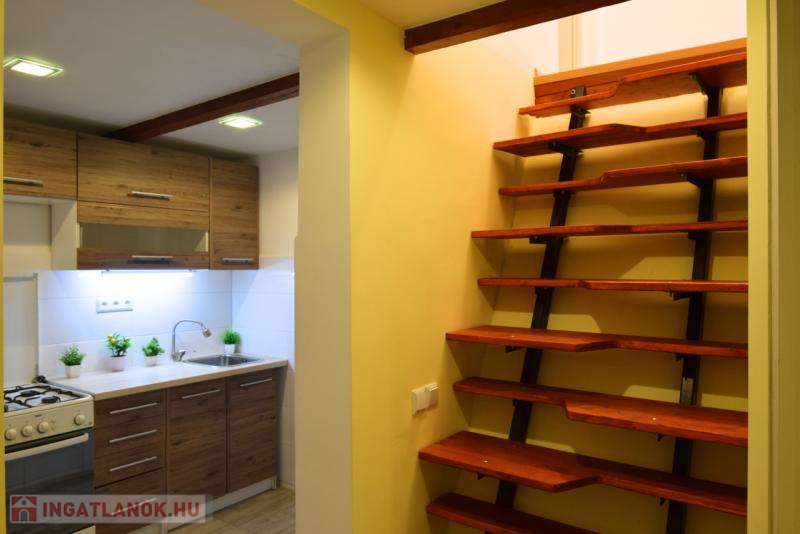 A 26 nm-es (bruttó 50 nm), jól kihasznált lakótérrel rendelkező ingatlan alsó szintjén található a nappali, beépített konyha, valamint egy zuhanyzós fürdőszoba WC-vel. Az emeleten két különnyíló hálószoba került kialakításra, amelyek csendes belső udvarra néznek.