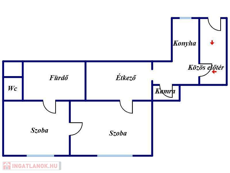 Az ingatlanban 2 szoba, étkező, külön fürdő és wc, kamra található.